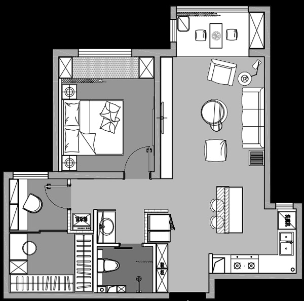 2、其中的一间卧室改为衣帽间+办公区,动线的末端,办公更安静;