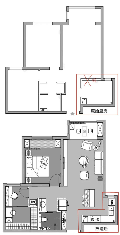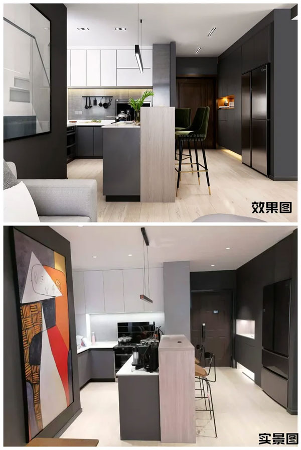 拆掉厨房原来的轻体墙,厨房改造成开放式空间,增加了夫妻二人的互动与交流,同时让出的部分空间改造为吧台式餐厅。