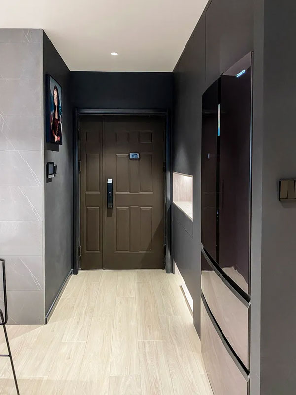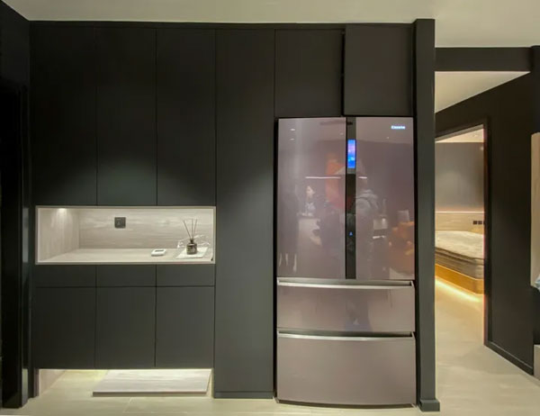 再往前是一个嵌入式的超大冰箱,与厨房正对,与客餐厅相连,拿取物品更方便。