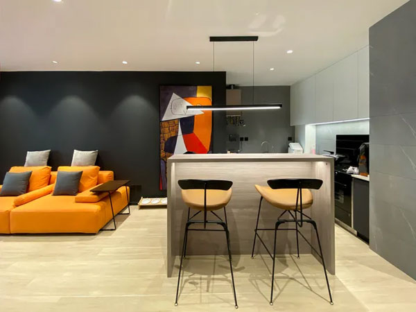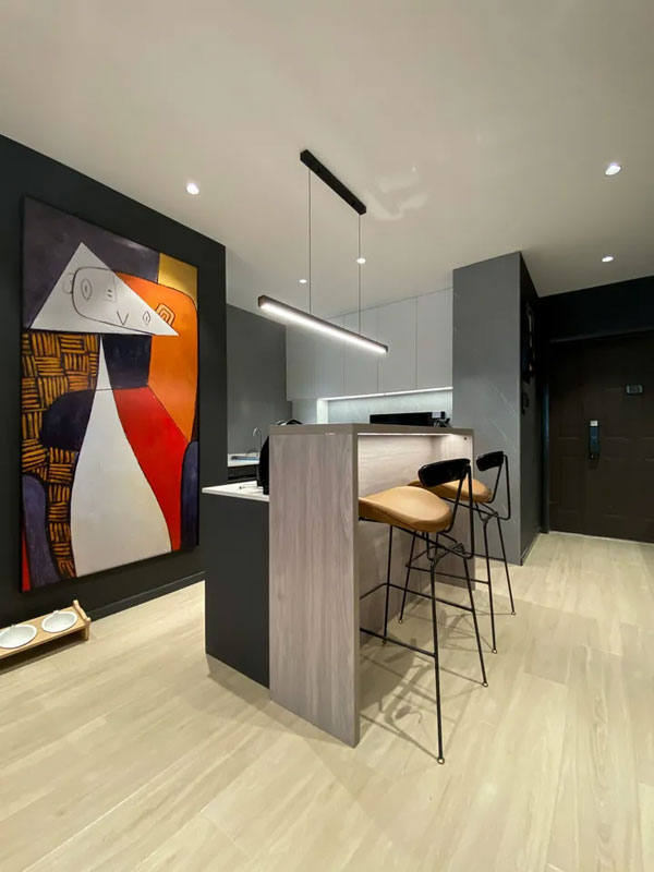 餐厅并没有按照常规设计,而是融入厨房的空间,在厨房边上设计一个小吧台来代替餐桌。