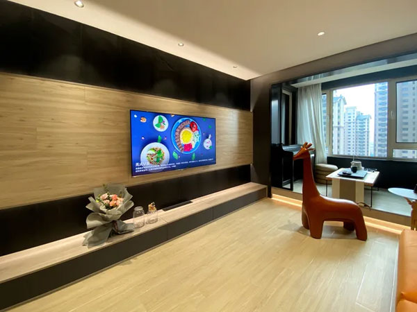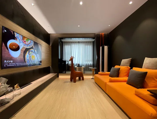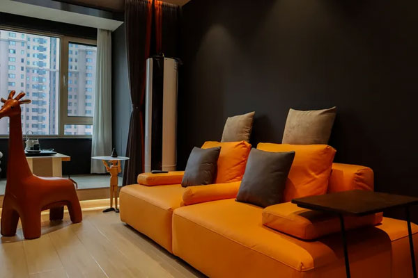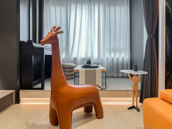 客厅里放有一只深橘色的长颈鹿,可以当做座椅,陪您一起看电视;橘色长颈鹿和沙发相呼应,色调统一,空间整体感更强。