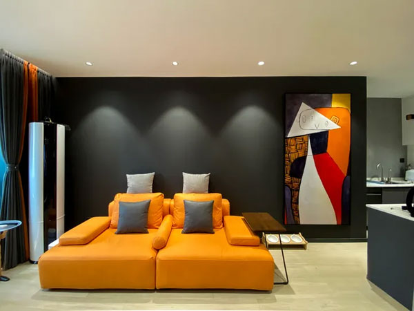 橘色的沙发在有射灯的黑色背景墙映衬下,格外的亮眼;配几个深色的抱枕,空间搭配更协调,与墙壁相呼应,高级而又不突兀;背后的一幅抽象巨画悬挂之上,让客厅空间整体更协调。