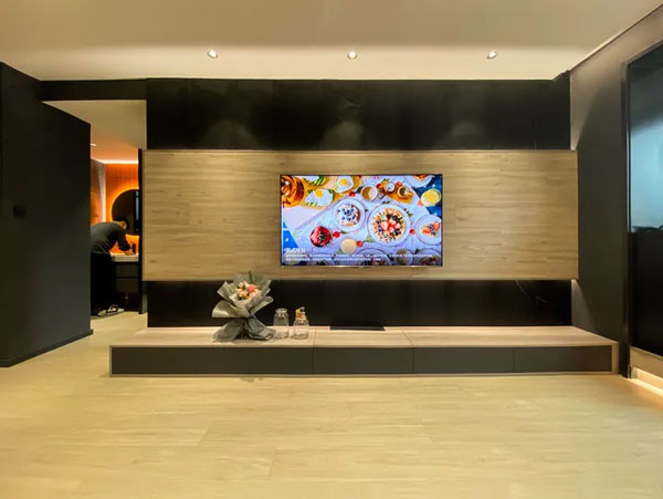 电视机一侧是青石板+木饰面的设计,改造水电时埋藏的φ50管,把电源线全都隐藏起来,让整个空间干净了很多。电视下方是一排通体的电视收纳柜,可以收纳客厅里的物品,使客厅更加整洁干净。