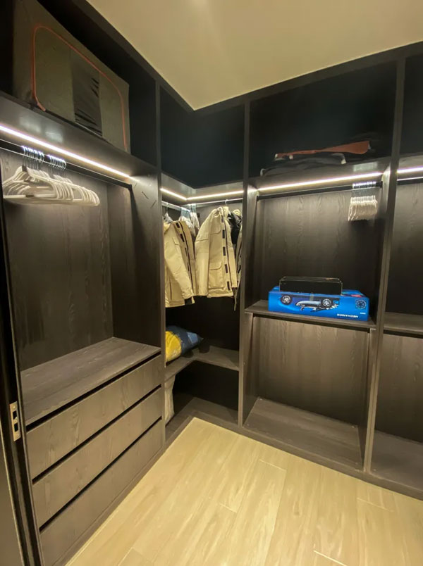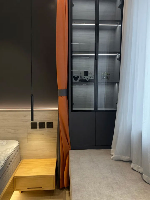 飘窗的两侧还设计了储物柜,放置一些日常用品,感应灯带为这个本就不大的储物空间增加了氛围感。