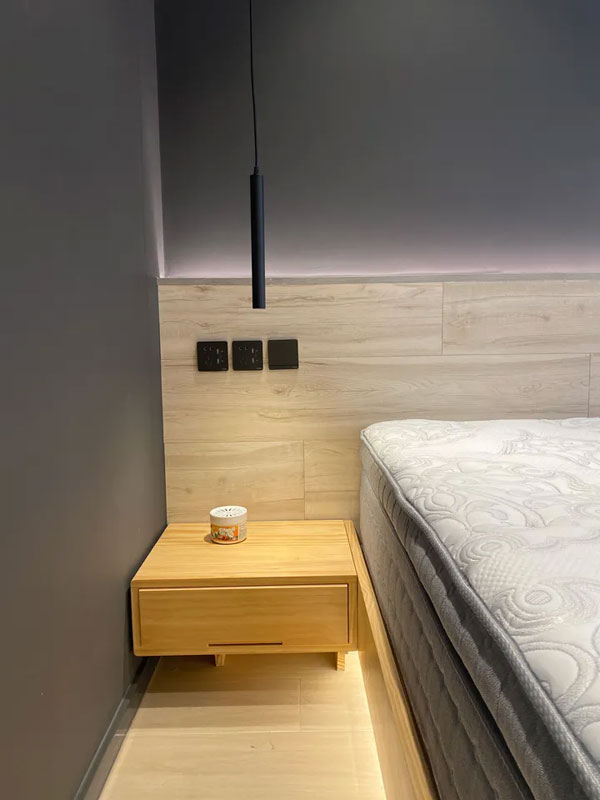 与床体相连的两个四方原木床头柜增加了空间质感;床头两侧的吊灯富有特色和艺术感,更具实用性;每个吊灯单独控制,晚上对方休息,互不影响,人性化十足;双侧的USB插座设计,为多个电子产品充值提供便利。