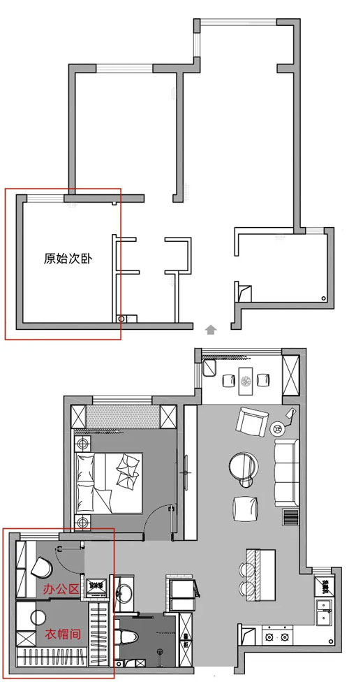 原始次卧改为衣帽间+办公区,在动线的尽端,更安静,更适合办公。