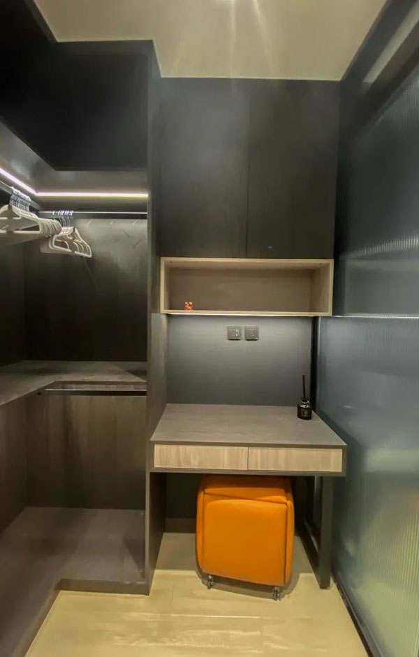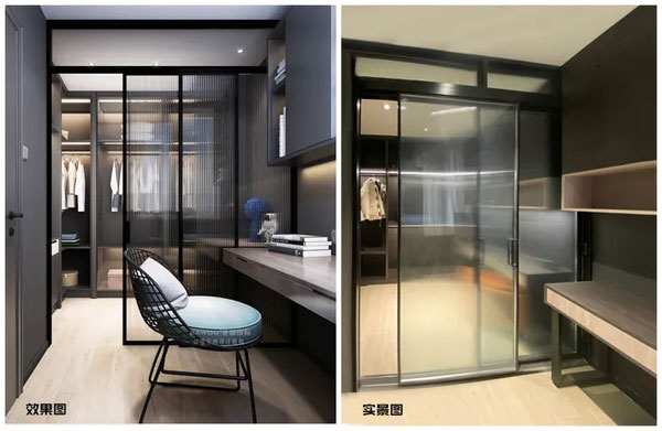 衣帽间柜体的开放式设计,方便屋主拿取衣物。此空间位于隐蔽的角落,关上玻璃门,空间就此独立,隐私空间凌乱一些也无妨;衣帽间还设计一个梳妆台,后期搭配化妆镜,方便女屋主在此化妆。