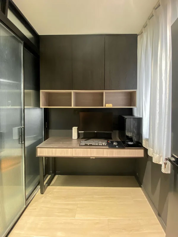 应男屋主的要求,原次卧的另一部分分割出一个办公区,配置简单,没有过多的装饰,只是满足日常的办公足矣;书桌的上方也设计了一个简易的收纳空间,下方开放式储物格,放置一些日常的办公物品,上方封闭式储物柜放置不常用的书籍等,不宜藏灰,方便清理。