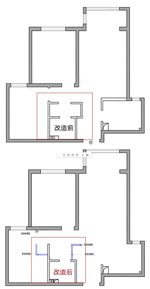 4、原有卫生间干区右侧内收,改造为玄关处冰箱位置,与入户鞋柜一体设计,紧邻客餐厨,拿取更方便;