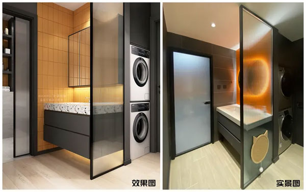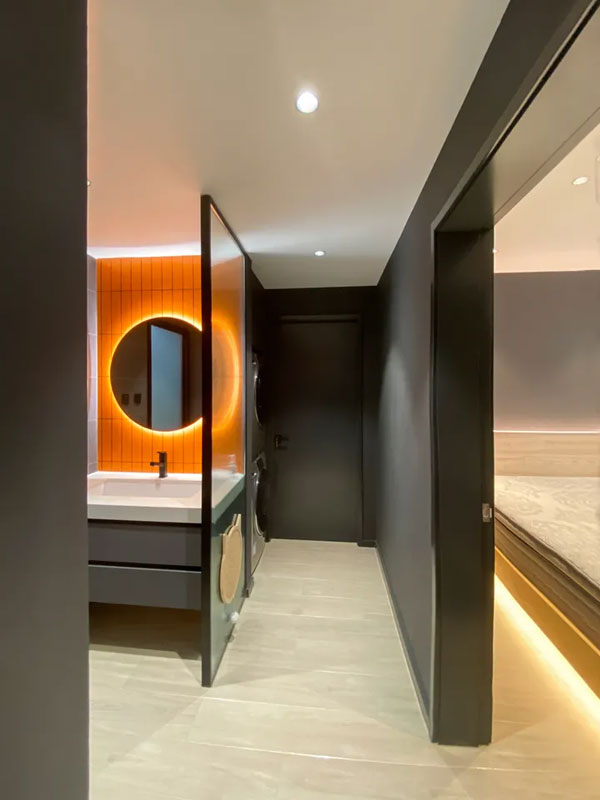 卫生间干区的装修效果落地达到95%以上;干区背后借用次卧空间打造洗衣区,与干区共用下水,设计简单实用;悬空洗手盆+墙排设计,方便后期清理卫生;上方橘色背景墙加上带有边缘灯光的镜体,实用的同时让整个空间充满时尚感。