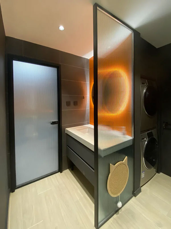卫生间干湿分离,拆掉原来与走廊之间的墙体,改为长虹玻璃,空间通透感更强;同时中和了过多黑色带来的压抑感。