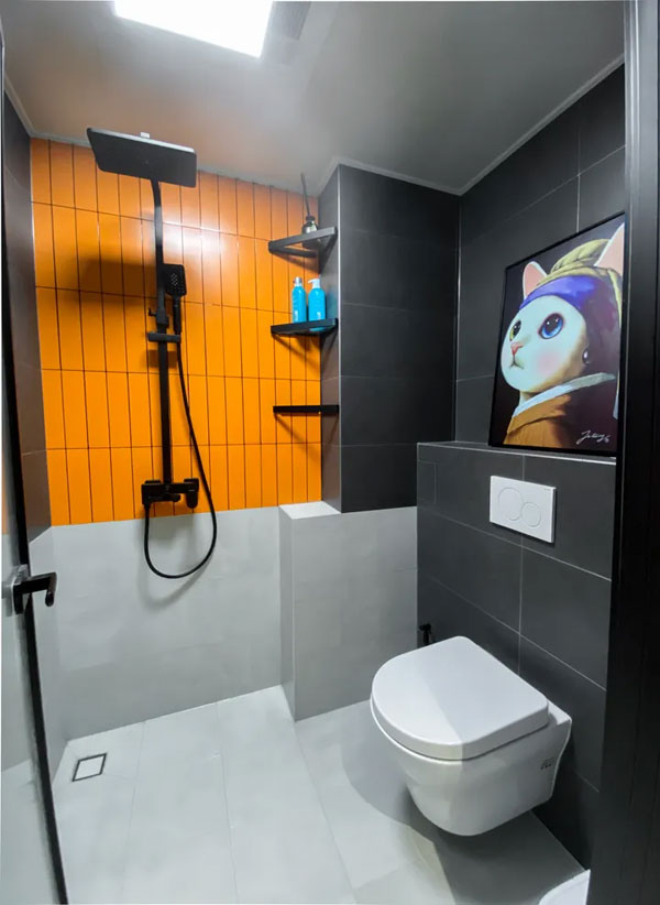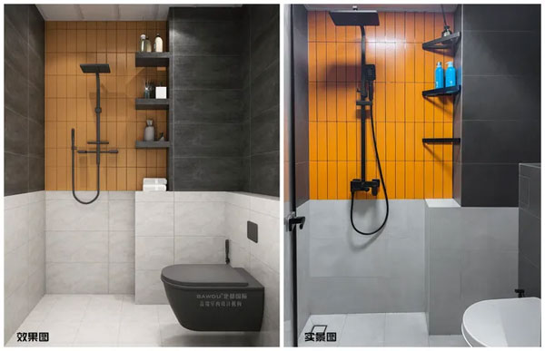 湿区的落地效果同样达到90%以上;拐角的三层三角置物架有很好的收纳功能,增大了空间利用率。淋浴区橘色的竖条砖,与其他空间色彩交相呼应,黑色的花洒在橘色的背景映衬下格外有质感。