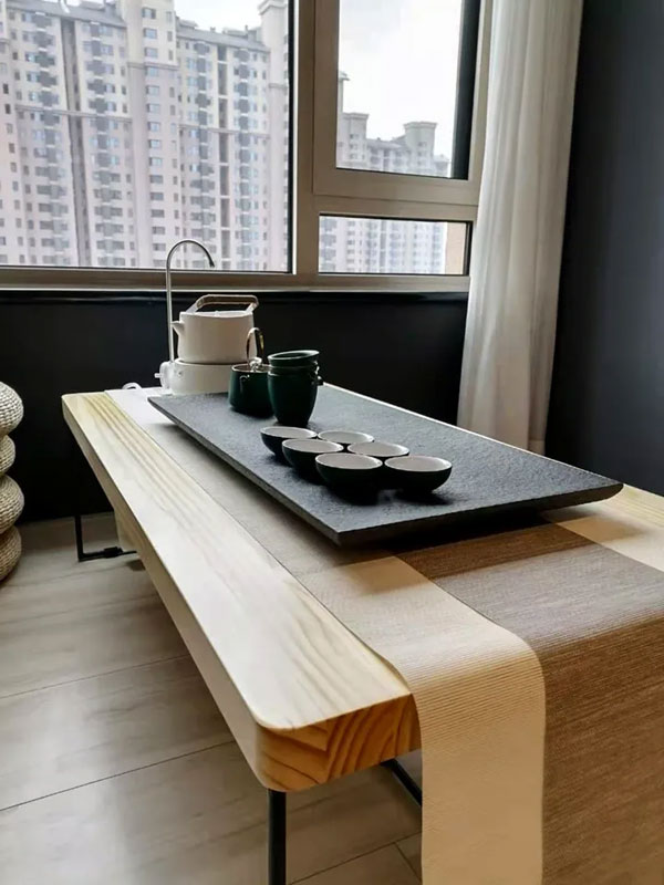 用蒲团代替椅子,不仅增大了整个区域的空间,而且也提高了行动的灵动性,大大的飘窗和白色的朦胧薄纱,让空间多了份唯美的感觉;午后的时光,静坐于此,一本书一杯茶就是两人对美好生活的享受。