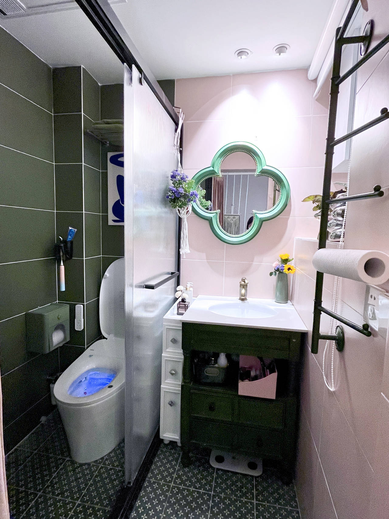 墙砖进行红绿撞色铺设,以玻璃隔断为中介线;